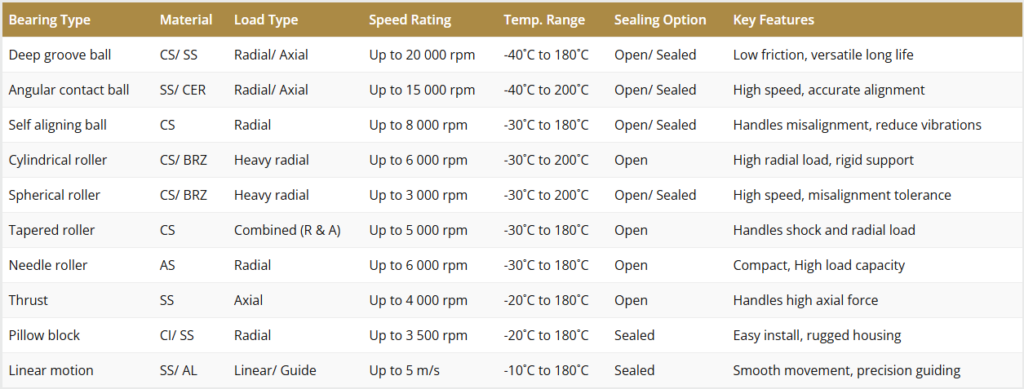 | Bearing Type | Material | Load Type | Speed Rating | Temp. Range | Sealing Option | Key Features |