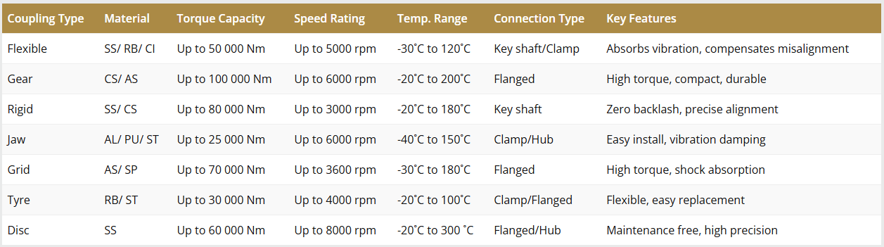| Coupling Type | Material | Torque Capacity | Speed Rating | Temp. Range | Connection Type | Key Features |