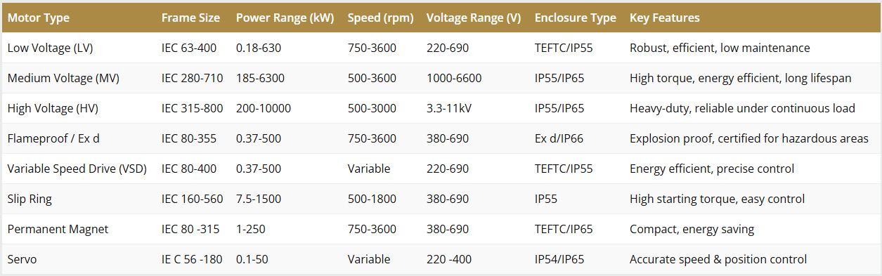 | Low Voltage (LV) | IEC 63-400 | 0.18-630 | 750-3600 | 220-690 | TEFTC/IP55 | Robust, efficient, low maintenance |