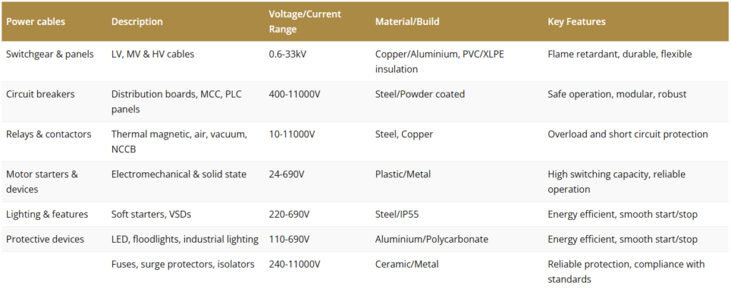 | Switchgear & panels | LV, MV & HV cables | 0.6-33kV | Copper/Aluminium, PVC/XLPE insulation | Flame retardant, durable, flexible |
