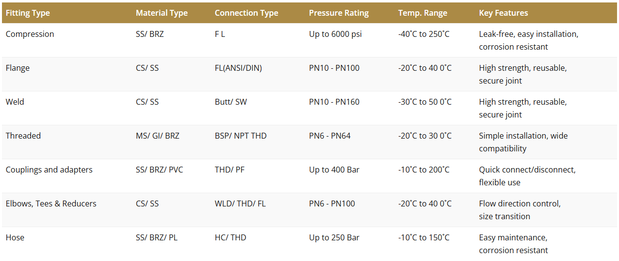 | Fitting Type | Material Type | Connection Type | Pressure Rating | Temp. Range | Key Features |