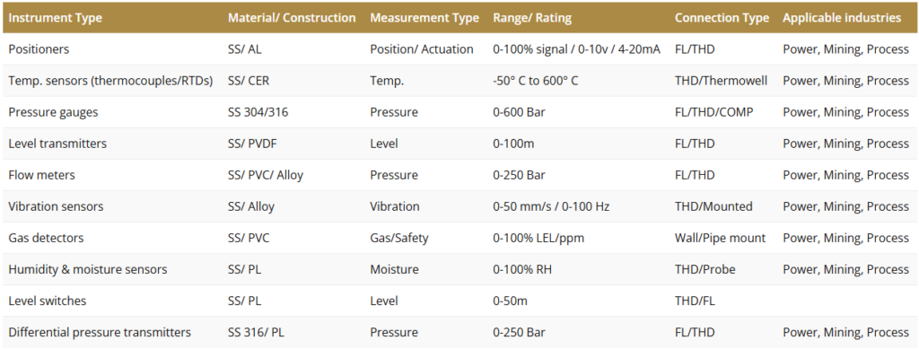 | Temp. sensors (thermocouples/RTDs) | SS/ CER | Temp. | -50° C to 600° C | THD/Thermowell | Power, Mining, Process |