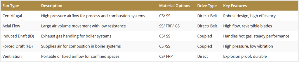 | Centrifugal | High pressure airflow for process and combustion systems | CS/ SS | Direct/ Belt | Robust design, high efficiency |