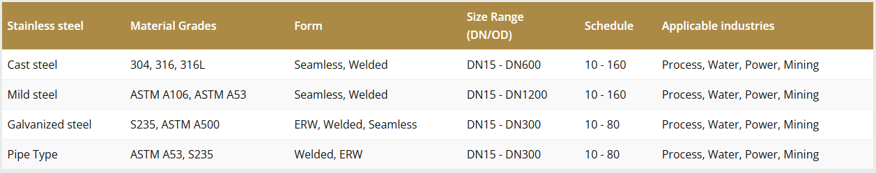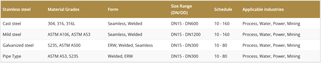 | Cast steel | 304, 316, 316L | Seamless, Welded | DN15 - DN600 | 10 - 160 | Process, Water, Power, Mining |