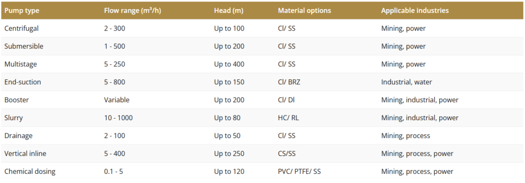 | Submersible | 1 - 500 | Up to 200 | Cl/ SS | Mining, power |
