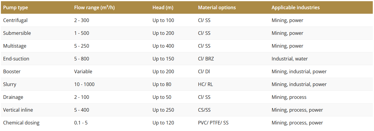 | Pump type | Flow range (m³/h) | Head (m) | Material options | Applicable industries |
