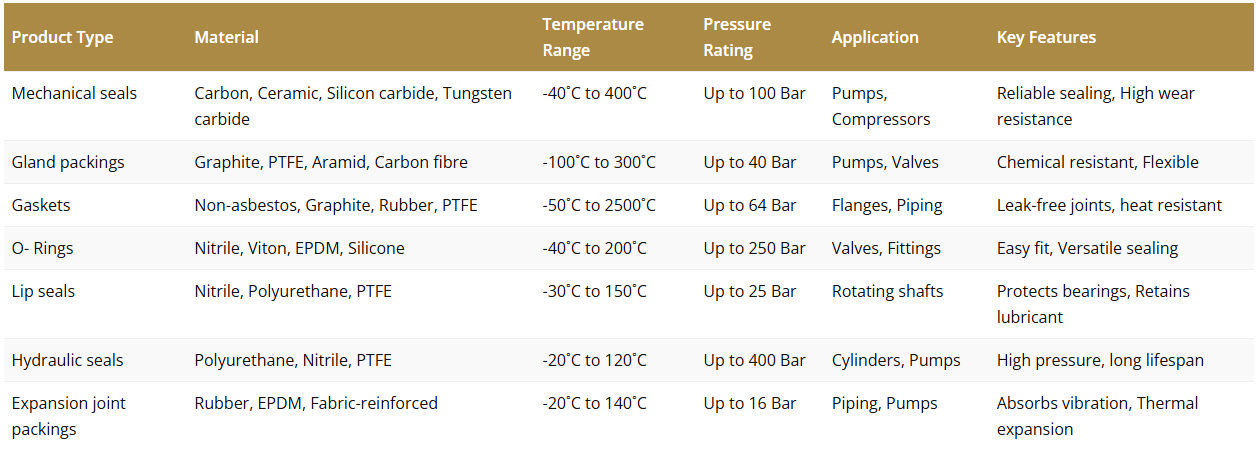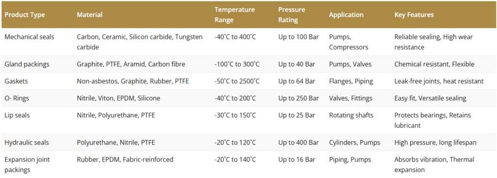 | Gland packings | Graphite, PTFE, Aramid, Carbon fibre | -100˚C to 300˚C | Up to 40 Bar | Pumps, Valves | Chemical resistant, Flexible |