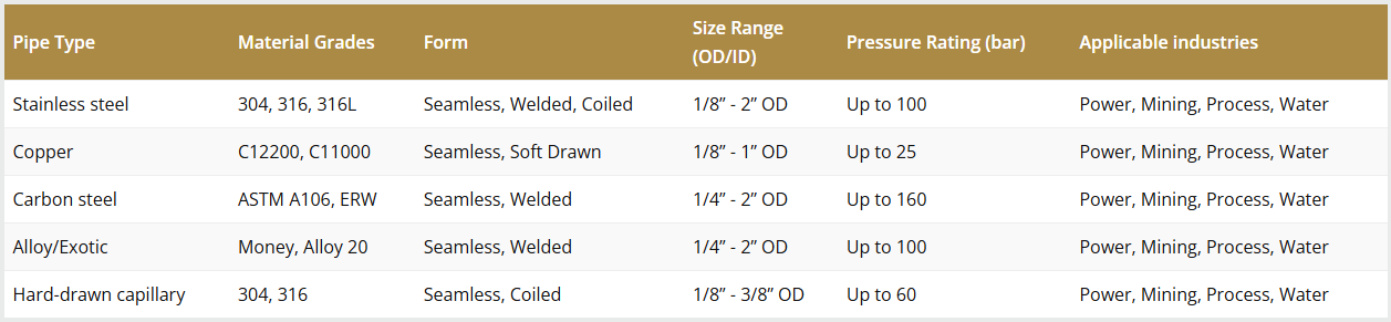| Stainless steel | 304, 316, 316L | Seamless, Welded, Coiled | 1/8” - 2” OD | Up to 100 | Power, Mining, Process, Water |