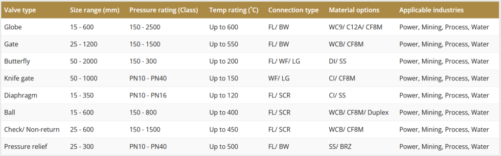 | Valve type | Size range (mm) | Pressure rating (Class) | Temp rating (˚C) | Connection type | Material options | Applicable industries |